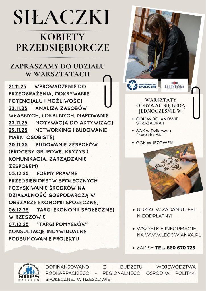 Zadanie „Siłaczki – kobiety przedsiębiorcze” jest propozycją cyklu wydarzeń warsztatowych promujących ekonomię i przedsiębiorczość społeczną wśród kobiet zagrożonych wykluczeniem społecznym, mieszkających na terenach wiejskich. Główne działania prowadzone będą w miejscowościach gminnych Bojanów, Dzikowiec i Jeżowe. Do współpracy zaprosiliśmy samorządy gminne, a także Rzeszowski Ośrodek Wsparcia Ekonomii Społecznej, a patronatem honorowym zadanie objęli Starosta Stalowowolski, Starosta Niżański.